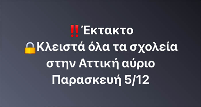 EKTAKTO! Κλειστά όλα τα σχολεία στην Αττική την Παρασκευή (5/12)