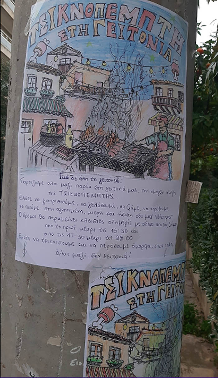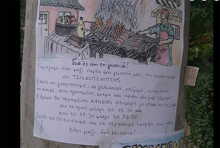 Ένα κάλεσμα που ξάφνιασε αναρτήθηκε στις κολώνες της γειτονιάς της οδού Νέστορος στο Χολαργό. Μία όμορφα επιμελημένη αφίσα απηύθυνε κάλεσμα σε όλους τους γείτονες, να συναντηθούν στο δρόμο και να γιορτάσουν μαζί την όμορφη μέρα της Τσικνοπέμπτης, όπως παλιά.