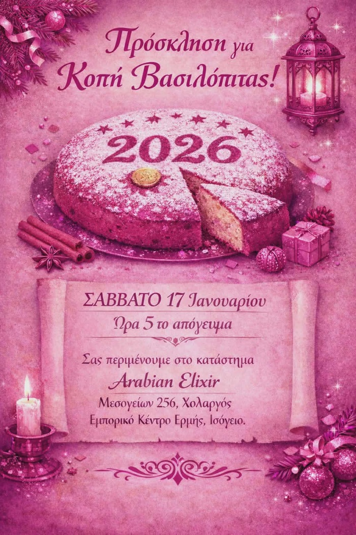 Το Arabian Elixir - Luxury Perfumes στον Χολαργό κόβει τη βασιλόπιτα το Σάββατο 17 Ιανουαρίου 2026 στις 5:00 το απόγευμα.